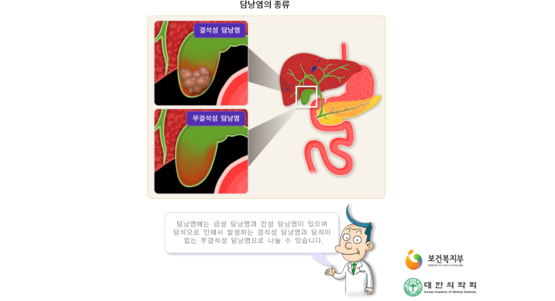 담낭염은 발생 경과에 따라 급성 담낭염과 만성 담낭염으로 나눌 수 있으며 담석으로 인해서 발생하는 결석성 담낭염과 최근 비만의 유병률 증가와 함께 담석이 없어도 담낭의 지방 침착으로 인해 발생하는 무결석성 담낭염으로 나눌 수 있습니다.