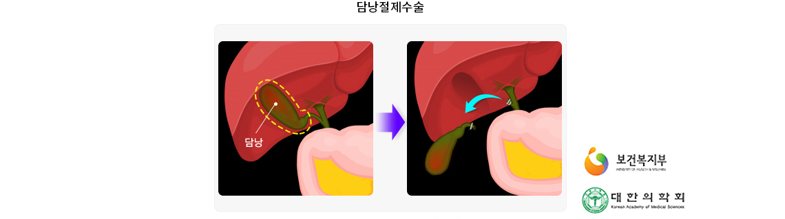 담석으로 인한 담낭염의 수술적 치료 시 담낭은 그대로 두고 안에 있는 담석만 제거하지 않고 담낭 전체를 제거하게 됩니다. 수술적 방법으로는 배에 최소한의 부위만을 절개한 후 복강경을 이용하여 담낭을 제거하는 복강경 담낭절제수술과 우상복부 위치를 절개하여 담낭을 제거하는 개복수술이 있습니다. 최근 복강경 담낭절제수술이 많이 시행되나 환자의 상태, 염증의 범위, 합병증 동반 여부에 따라서 개복수술이 시행될 수 있습니다.